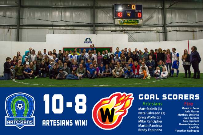 TUMWATER, Wash. – Matt Stalnik’s hat trick and a pair of goals from both Greg Wolfe and Nate Salveson led the Oly Town Artesians to the first win in franchise history, a 10-8 victory over the Wenatchee Fire on Saturday night at Olympia Indoor Soccer.