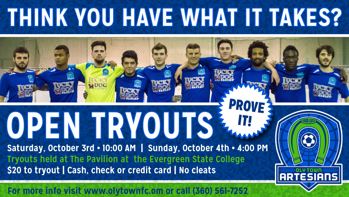 The Oly Town Artesians semi-professional indoor soccer club kicks off their 2015-2016 preseason with open tryouts on Saturday, October 3rd at 10:00 AM and Sunday, October 4th at 4:00 PM. Tryouts cost $20 and can be paid with cash, check or credit card when players arrive at The Pavilion on the campus of The Evergreen State College. Players should wear turf shoes. Please no cleats.